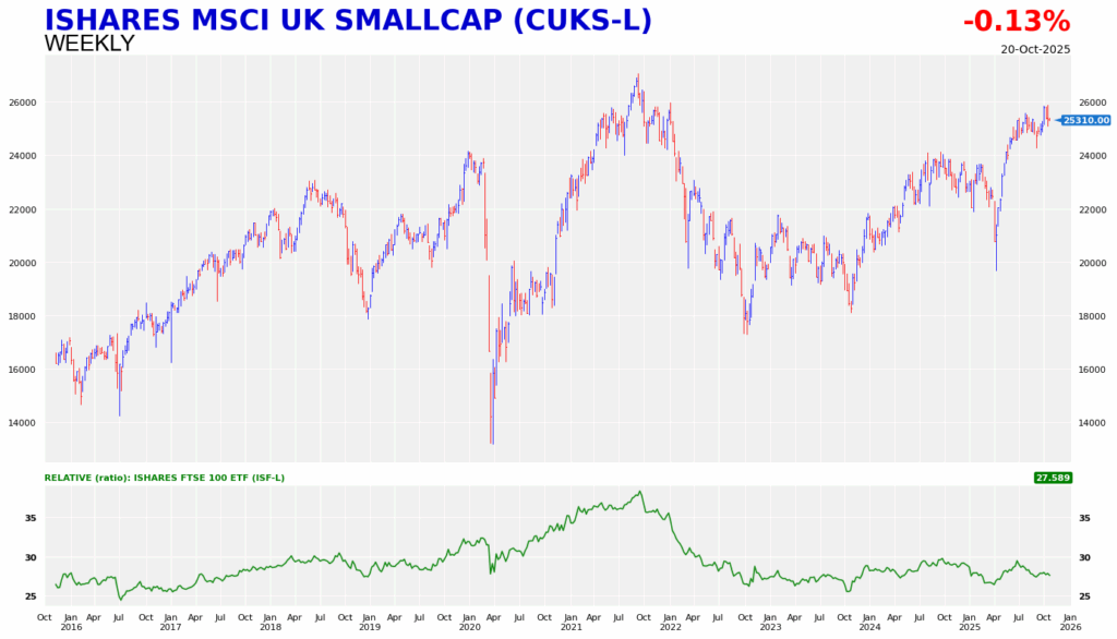 If I use the iShares MSCI UK Small Cap ETF (CUKS, factsheet) as a proxy for the sector, clearly it is lagging large-cap stocks. The FTSE AIM All Share Index (AXX) tells the same story.