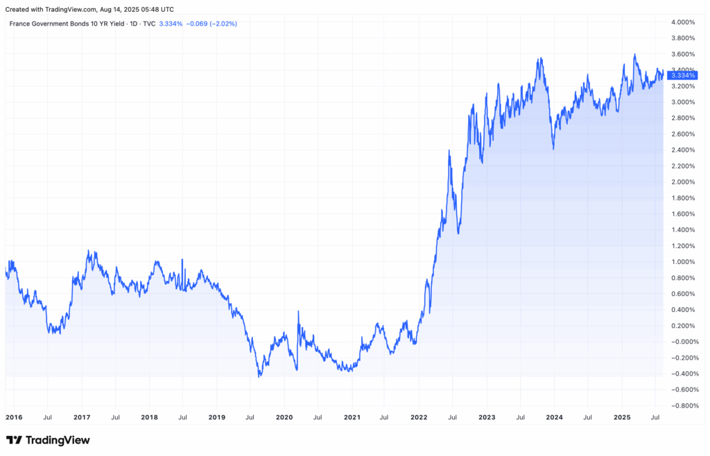 As a result, the market is continuously slapping higher yields on French bonds. Look at the unmistakable uptrend of the French 10-year Bond Yield below. At 3.33 percent, these French Obligations assimilables du Trésor (OATs) are yielding just 0.1 percent below that of Italy’s.