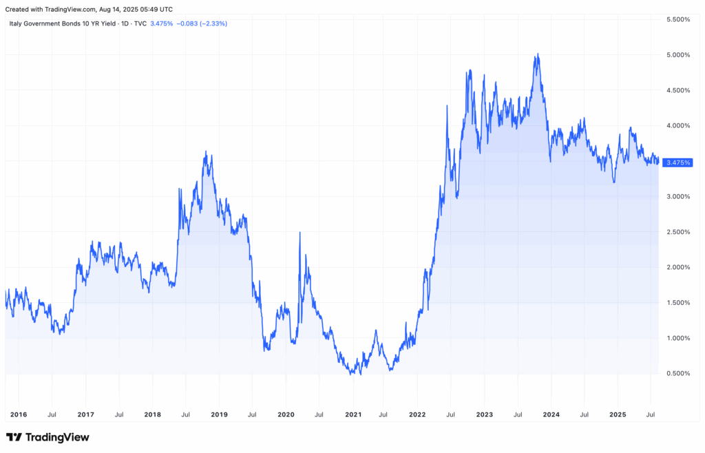 But things have shifted substantially since. The Italian economy has stabilised; its 10-year bond yield is currently steady around 3.5 percent, which is 150bps below its 2023 peak (see below).