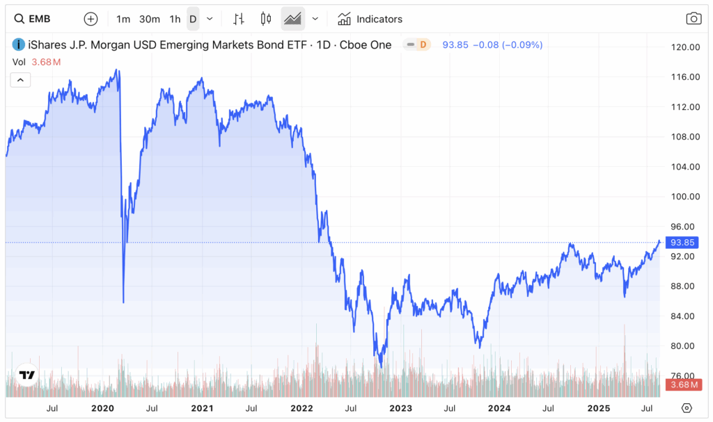 EM bonds are outperforming those from advance economies. The $13 billion iShares JP Morgan Bond ETF (EMB, factsheet), which hold bonds from Argentina, Ecuador, Ghana etc, is up 8 percent YTD. Prices rallied to the highest level since 2022. A further base breakout is developing at a$94 (see below).