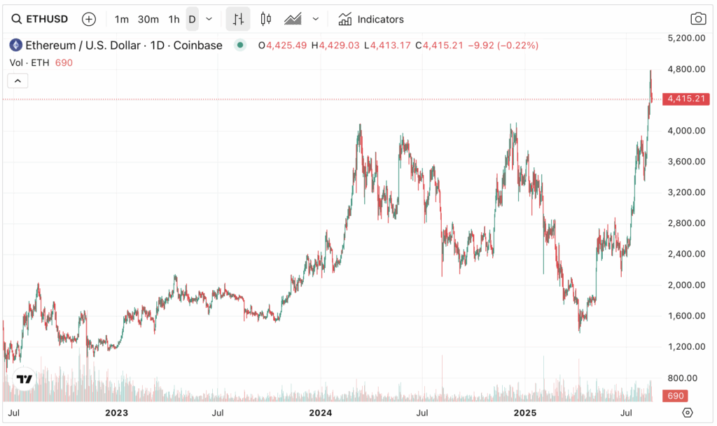Ethereum (ETHUSD), the second largest crypto asset by market cap after Bitcoin, soared to new multi-year highs this month. The $500-billion asset broke the psychological $4,000 resistance level and immediately jumped 20 percent to $4,800. Overbought, a healthy consolidation back to that former resistance – now potentially support – is underway.
