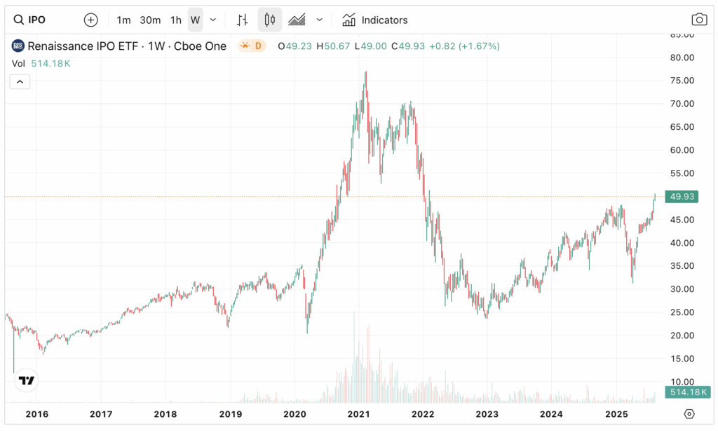 IPOs, another sign of market conditions, are hot and gaining. Many newly-listed stocks are experiencing large one-day pop (such as Bullish, ticker: BLSH). Look at the exchange-traded fund that only track IPOs (Renaissance IPO, ticker: IPO); prices are surging to the highest level since 2022 (see below).