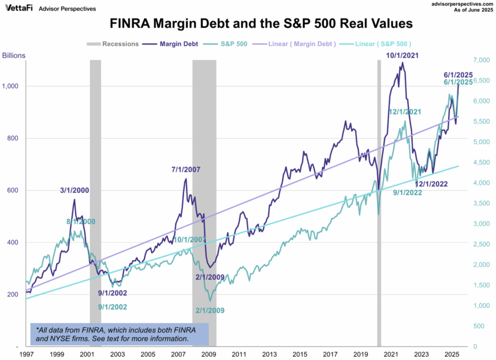 US June’s margin debt – debt used to leverage and magnify stock positions – crossed $1 trillion for the first time since 2021 (see below). This suggests investors are loading up risky assets massively and constantly, possibly aided by Fear Of Missing Out (FOMO).