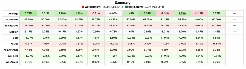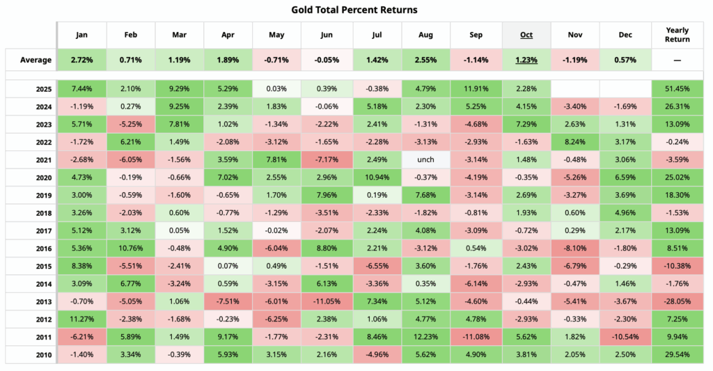 Interestingly, the tenth month of the year typically secures good price stability for gold prices. The average return for October is computed at about 1.23 percent, whilst the worst return is at -3.02 percent. This is the lowest drawdown amongst all months.