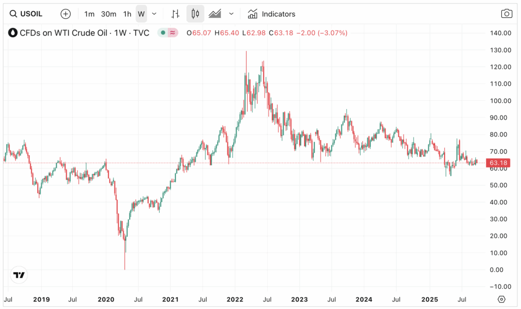 As we head into 2026, US WTI oil is still under some selling pressure. Prices touched $55 a barrel earlier this year; its long-term price trend points south (see below).
