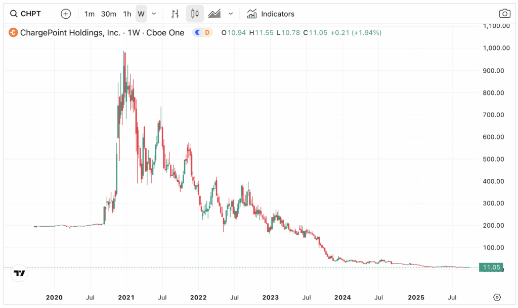 Look at Chartpoint’s (US:CHPT) stock chart below. Prices suffered from a deep drawdown from $900 (dilution high) to a mere $11. Ouch!