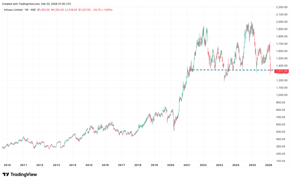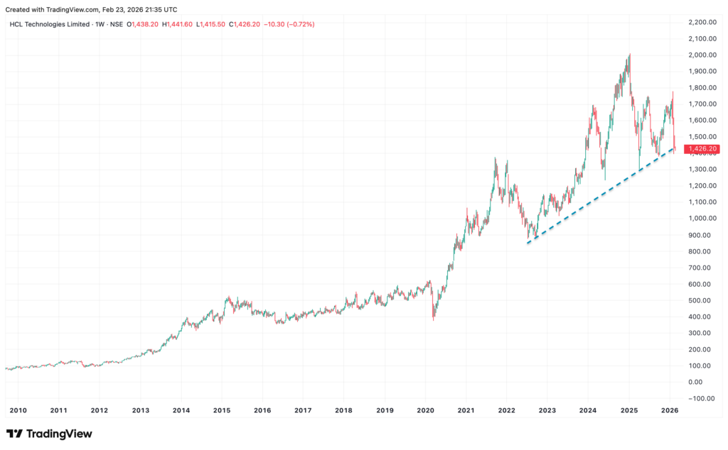 Tech Mahindra – reverted to its multi-year uptrend support. Given prices haven’t really made new all-time highs since 2022, it shows that the cyclical trend has flattened. A break of the support at 1,200-1,300 may lead to a swift test of major support at 1,000.