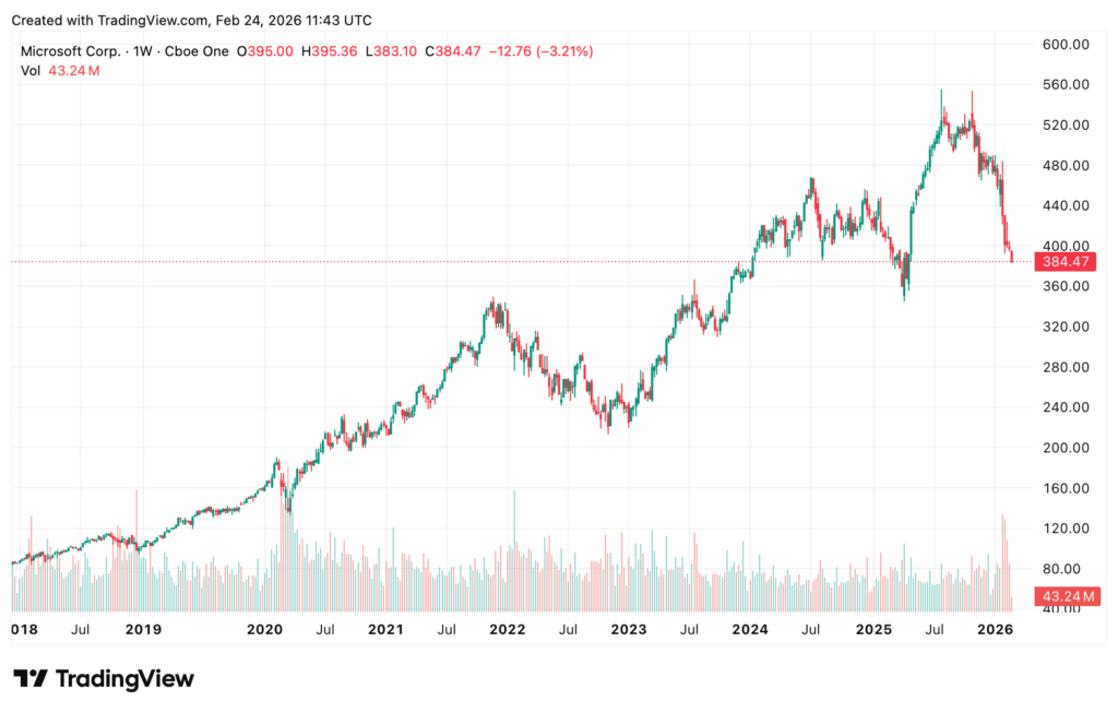 Microsoft, for example, is still falling like a rock. At this rate of decline, the MSFT share price will soon test the 2025 lows (see below).