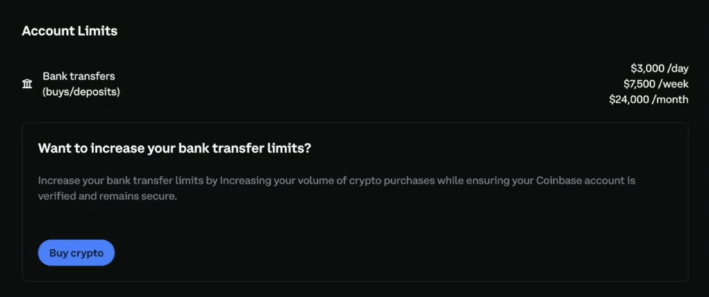 With Coinbase for example, limits depend on your account level. For example, when you have a ‘Level 1’ account, the maximum trade size with 3D Secure (credit/debit card) purchases is £3,000.