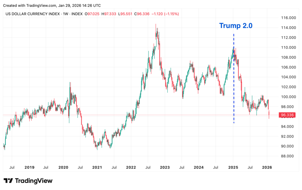 Does it? The market is not so sure. If I superimpose the current administration’s start date (Jan 2025) on DXY’s chart, you see immediately why the market is not convinced. The index peaked around the time when the Trump presidency began. And the dollar has been swimming in a weak, lethargic state since. So much for the strong dollar comment.