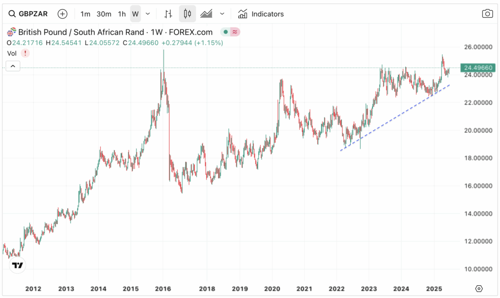 - GBPZAR surged to long-term highs in recent months